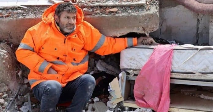 O homem que aparece na foto é Mesut Hancer. No registro, ele é visto sentado e agarrado à mão de sua filha Irmak Hancer, de 15 anos. Em luto, o pai não saiu do lado do corpo da filha, esmagada no próprio colchão pelos escombros de um prédio.
