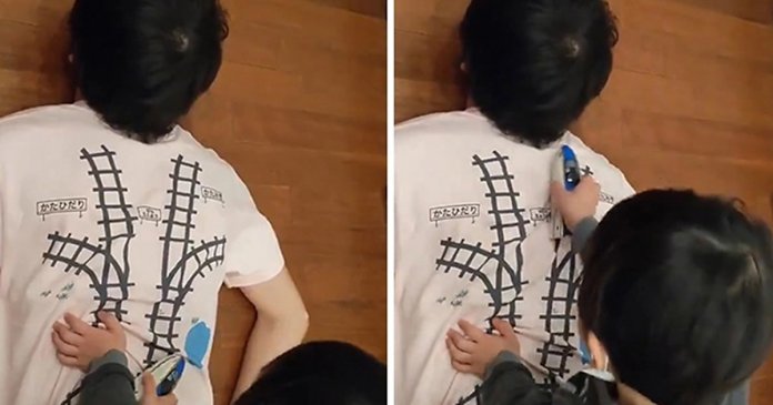 Ken Kawamoto, o papai inventivo mandou estampar trilhos de trem nas costas de uma camiseta. Dessa forma, o filho gasta toda a sua energia brincando com seu carrinho pela trilha, enquanto o pai alivia as tensões do dia a dia. Não é o máximo?