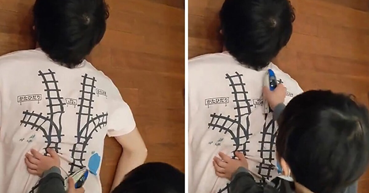 以前作った「寝転がってるだけで子供がマッサージしたくなるTシャツ」をきれいに作り直して出品した:https://t.co/o4QXllvo8h 背中にプラレール幅対応のレールが描いてあるので、子供が大喜びでプラレールを走らせてくれます。気持ちいいです。 pic.twitter.com/5wZ8poE5hJ