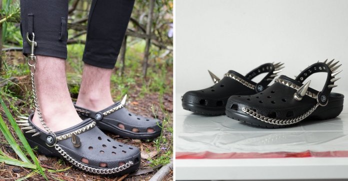 Eles criaram as Goth Crocs, uma espécie de reinvenção das crocs que cansamos de ver o vizinho usando com meia para regar as plantas no jardim. Elas são pretas (como não poderiam deixar de ser, claro!) cheias de espinhos e, em alguns modelos até permitem que você prenda a corrente do calçado na barra da calça (também preta, por favor!). Não é o máximo?