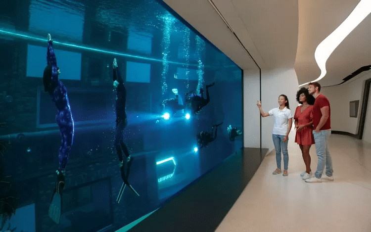 Entre esses feitos notáveis, está o Deep Dive Dubai, a piscina de mergulho mais profunda do mundo, reconhecida pela entidade recordista em 2021 por sua impressionante profundidade de 60,02 metros.