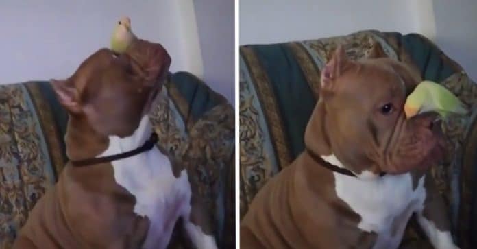 Nas imagens, você pode ver um adorável cachorro Pit Bull sentado assistindo televisão como se fosse humano, até que o pássaro de estimação da casa interrompe sua sessão de TV para pousar em seu focinho.