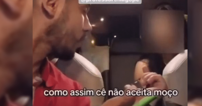 Nas imagens, a passageira tenta usar seu vale alimentação para pagar a viagem, mas o motorista informa que a máquina de pagamento não é compatível com esse método. Ele oferece alternativas, como usar outro cartão ou transferência via PIX, mas a passageira alega não ter dinheiro adicional e questiona por que seu cartão não é aceito, já que o utiliza em outros estabelecimentos.