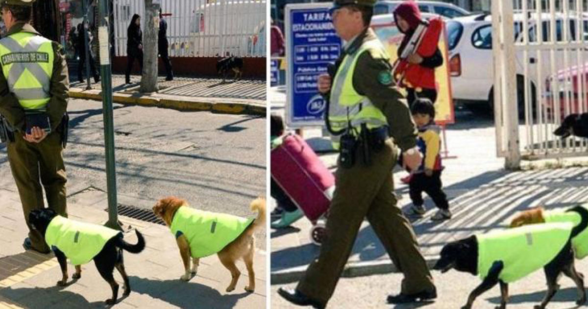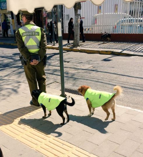 Desde o ano passado os policiais chilenos da cidade de Quilpué, conhecidos como Carabineros, contam com reforço pra lá de especial. Ao adotarem cães de rua, estes policiais conquistaram fiéis companheiros de ronda.