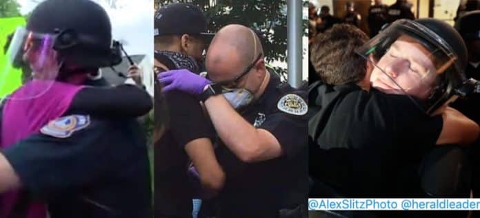 Protesters asked police to kneel with them in front of the police dept. on Main Street. After a number of officers kneeled, protesters moved forward to embrace them. @heraldleader @pbaniak @HLpublicsafety pic.twitter.com/mZ8NiiEZPq