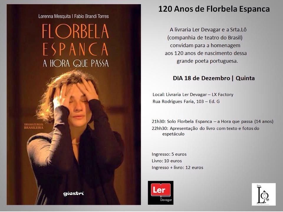 As comemorações pelos 120 anos de Florbela Espanca, encerram-se no dia 18 de dezembro, em Lisboa, com a apresentação do solo teatral Florbela Espanca – a hora que passa, às 21h30, no Teatro da Livraria Ler Devagar, na LX Factory. A sessão dessa noite contará especialmente com um piano de cauda, que será tocado pela actriz Lorenna Mesquita durante o espetáculo.