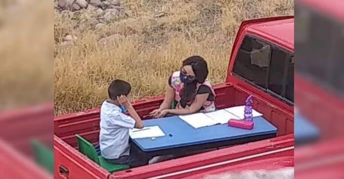Essa professora foi uma delas. Seu nome é Nay e ela é uma professora mexicana que decidiu inovar e transformar seu automóvel em uma ‘sala de aula móvel’, colocando duas cadeiras e uma escrivaninha na caçamba de sua caminhonete. Assim, ela visita seus alunos de casa em casa para explicar-lhes o conteúdo.