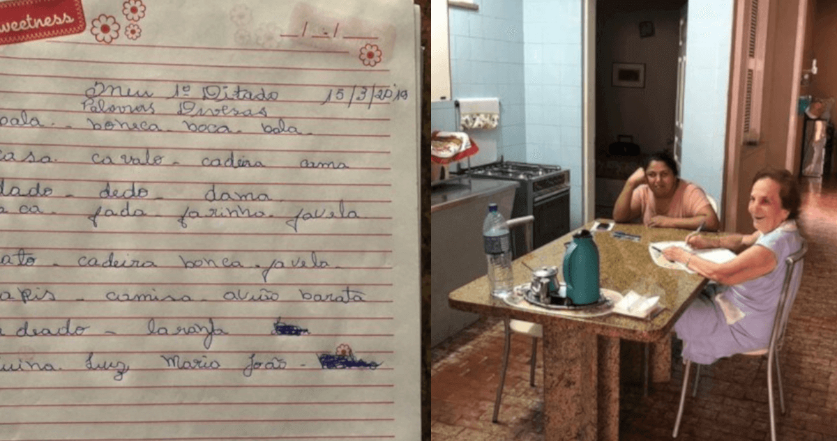 As aulas, iniciadas de março, estão surtindo resultados positivos. A neta de Ione, Manuela, fez esta foto do caderno de Maria do seu primeiro ditado completo, com algumas palavras escritas, expondo o progresso da cuidadora.