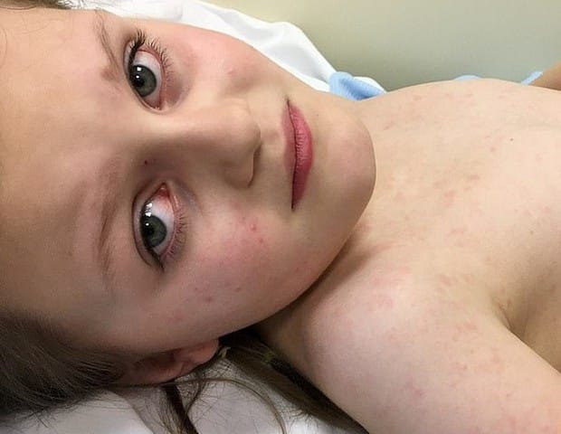 “Todos os seus sintomas eram consistentes com catapora, mas quando as manchas não começaram a formar bolhas, fiquei preocupada. Ela estava com tantas dores no corpo que você não conseguia tocá-la. Eu tive que carregá-la para o hospital e segurá-la porque ela estava toda mole”, contou. A língua da menina também adquiriu uma cor branca e espessa pouco antes de chegar ao hospital — o que geralmente é consistente com uma infecção de garganta, mas a garganta dela estava bem.
