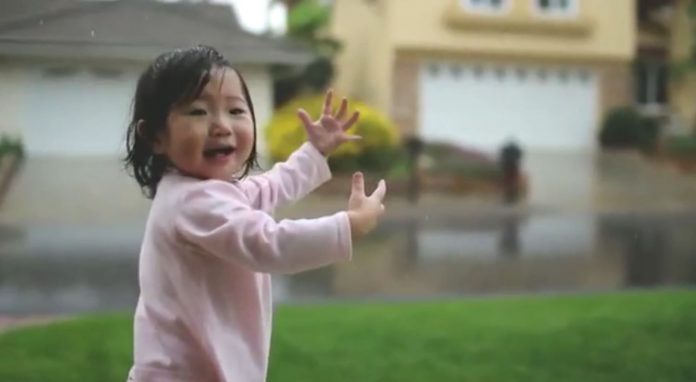 A mãe filma o momento em em ela descobre a chuva. Deliciem-se também com essa explosão de sensações.
