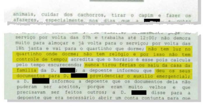 A empregada contou que, depois de trabalhar por cerca de 11 horas por dia, com pouco tempo para as refeições, dormia em um quartinho nos fundos da casa que não tinha energia elétrica e nem sequer um relógio. Ela contou que calculava a passagem de tempo conforme o dia ia escurecendo.
