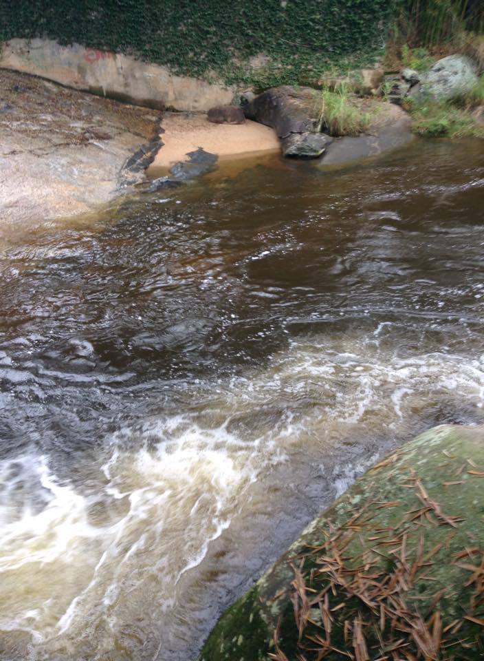 Hoje, há pouco, em mais um dia de caminhada com os cachorros até a cachoeira, Jack resolveu pular uma distância, hoje, maior por causa das chuvas constantes, entre duas pedras, que não davam conta de suas perninhas curtas. Lá se foi o Jack rio abaixo e eu atrás dele.
