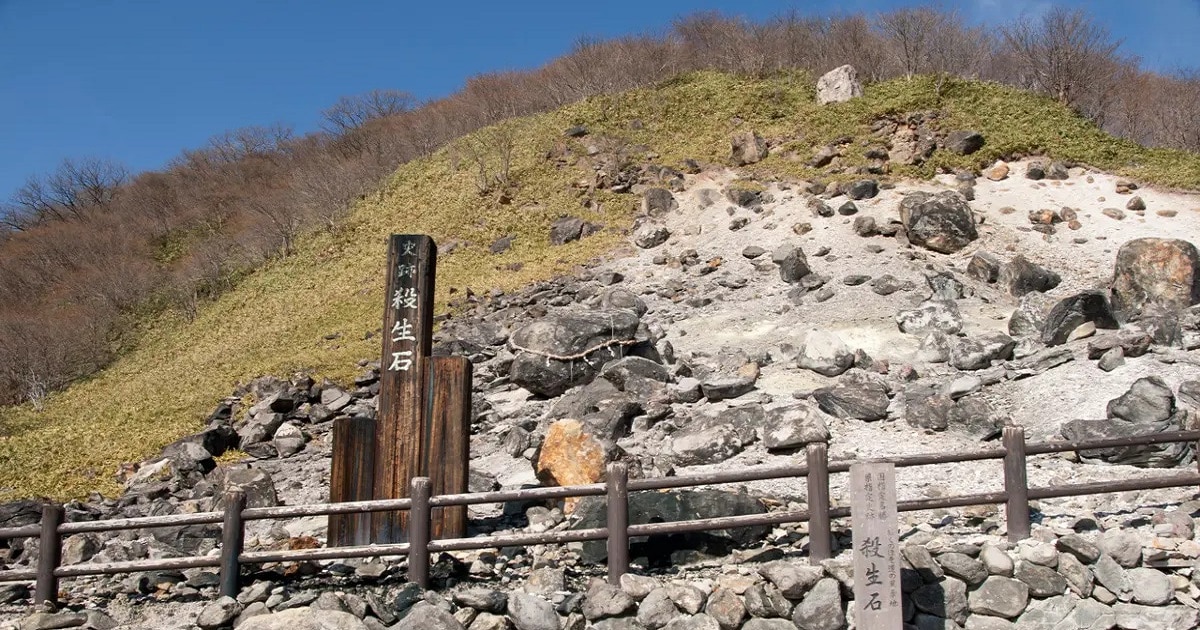 De acordo com a mitologia, a rocha vulcânica que fica em Nasu, na região montanhosa de Tochigi, próxima a Tóquio, seria o cadáver transformado de Tamamo-no-Mae. Ela era supostamente uma bela mulher, cujo espírito estava possuído por uma raposa de nove caudas, ou kitsune – um espírito demoníaco conhecido por truques e ilusões usando disfarces. Tamamo-no-Mae fazia parte de um plano para seduzir e tirar a vida do imperador Toba, que governou entre 1107-1123. Toba ficou doente como resultado da trama.