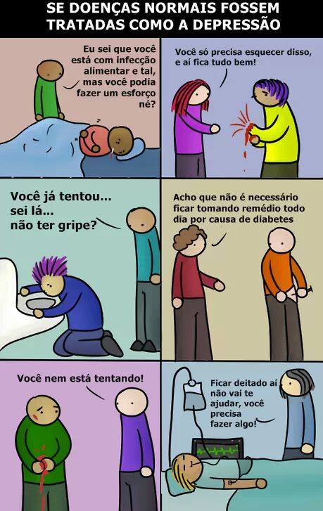 Abaixo, uma tirinha bastante irônica, mas que deixa claro como uma pessoa que realmente tem a doença passa no sentido de simplificação e responsabilização pelo seu próprio quadro. Vale conferir e refletir.