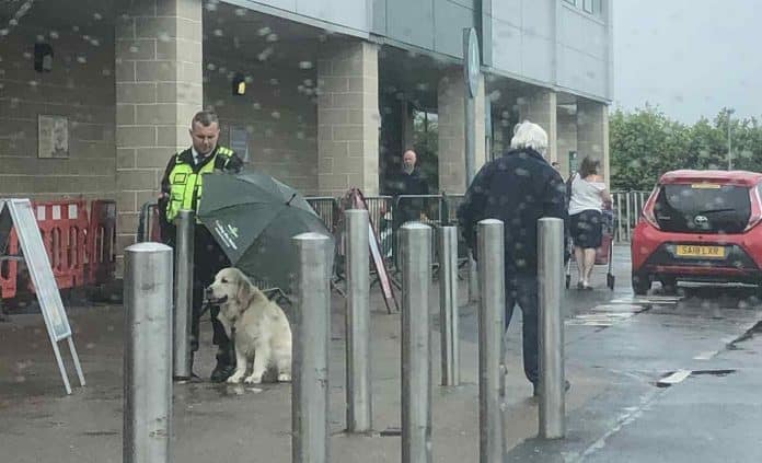 Shout out to this @Morrisons security man keeping this good boy dry. He said ‘well you never know how dogs feel about the rain’ pic.twitter.com/B9CPWI7u5Q