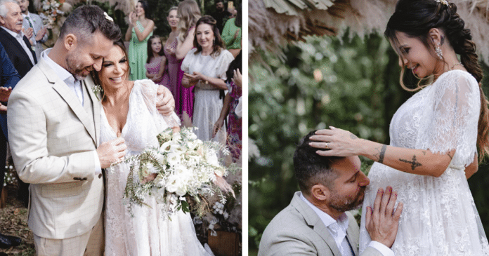 A influenciadora, grávida do segundo filho do sertanejo, está ao lado de Marlon desde o final de 2020. O casal já tem um filho juntos, Benício, que recentemente completou 1 ano de idade. Nas fotos da cerimônia, é possível ver o carinhoso gesto do artista beijando a barriga de sua esposa por cima do vestido de noiva.