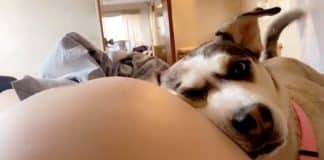 Cachorrinha adora ouvir seu irmão dentro da barriga de sua mãe...