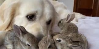 Cachorra golden retriever se torna mãe adotiva de adoráveis coelhinhos filhotes