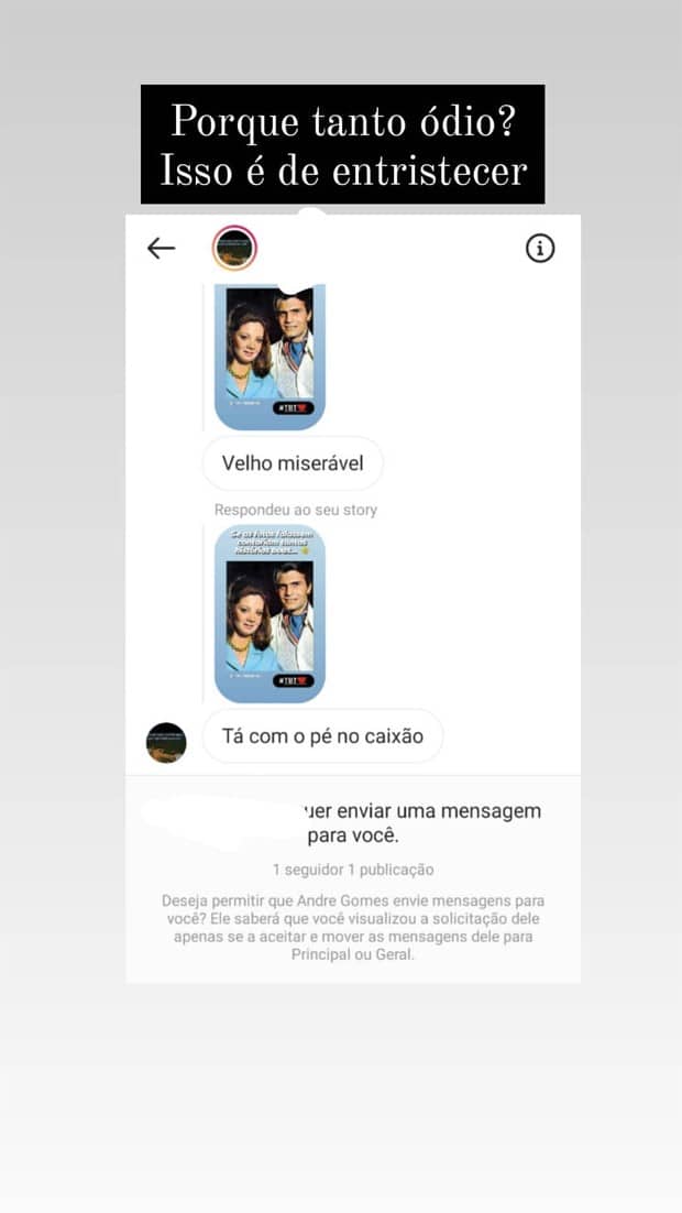 O ator, que tem 85 anos, tinha publicado em seu perfil no Instagram uma foto sua com a mulher, a também atriz Glória Menezes. O clique rendeu inúmeras curtidas e muitas mensagens positivas de fãs do casal. Entretanto, nem só de amor vive a internet, como bem sabemos, e um internauta enviou para o ator as seguintes mensagens: “Velho Miserável” e “Está com o pé no caixão”.