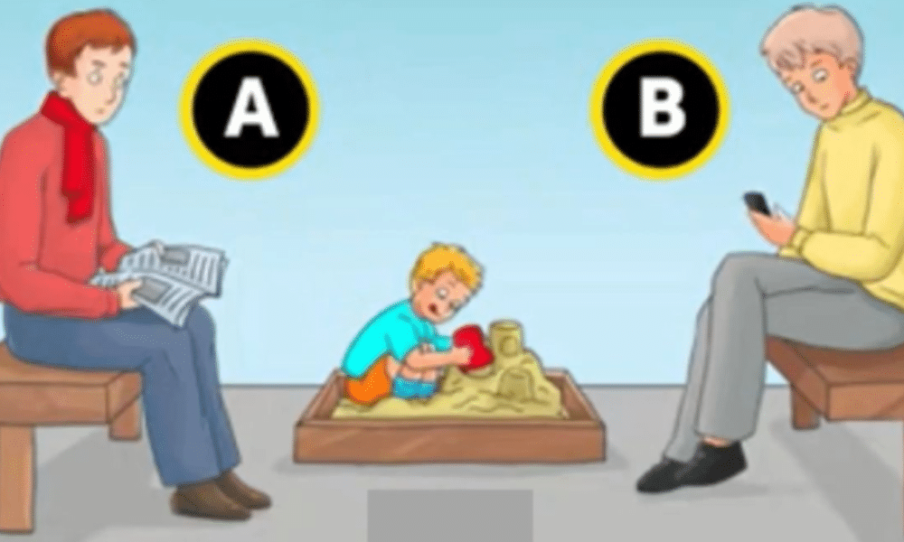 Na imagem, vemos uma criança brincando animadamente em uma caixa de areia. Ao lado dela, estão dois homens sentados em bancos opostos: o homem A, à esquerda, veste uma blusa vermelha com cachecol e segura um jornal; o homem B, à direita, usa uma blusa amarela e está concentrado no celular. Ambos parecem adultos que poderiam estar acompanhando a criança, mas apenas um deles é o pai verdadeiro.