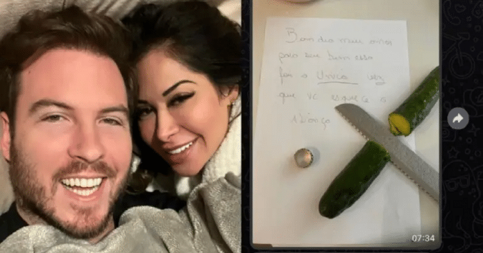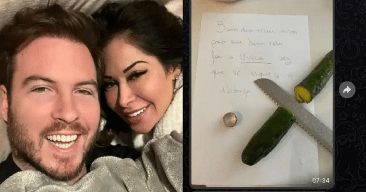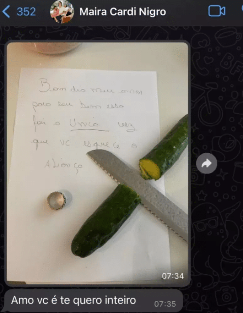O trecho dessa conversa foi compartilhado por Nigro em seus Stories no Instagram na noite de segunda-feira (2). Maíra Cardi enviou uma foto de uma carta que escreveu para seu marido, com a mensagem: “Para o seu bem, essa é a única vez que você esquece a aliança”. Ao lado da carta, Maíra deixou uma faca e um pepino cortado ao meio, acrescentando: “Amo você e te quero inteiro”.