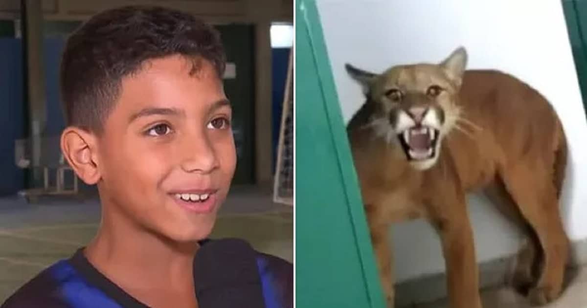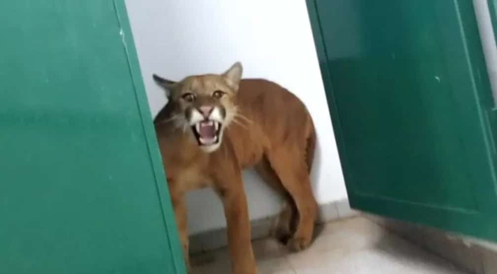 O menino acabou encontrando uma onça parda escondida em um dos banheiros da escola e levou o maior susto!