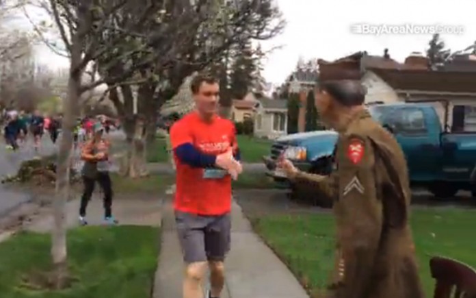 Joe Bell é um veterano de guerra de 95 anos que assistia tranquilamente a uma corrida sentado em frente a sua casa quando espontaneamente os corredores começaram a sair da rua e ir ao seu encontro para cumprimentá-lo numa demonstração clara de respeito e orgulho por tê-lo visto lá. A beleza da cena não está somente no ato, mas na maneira como as pessoas da sequência seguiram o exemplo e fizeram da corrida também um lindo tributo.