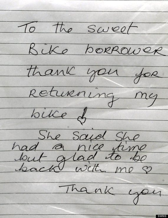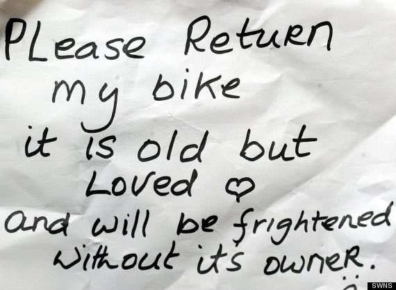 Mas logo em seguida ela decidiu adotar outra atitude – escreveu um bilhete educado pedindo sua bicicleta de volta, e o fixou a um poste de luz perto do local do roubo.