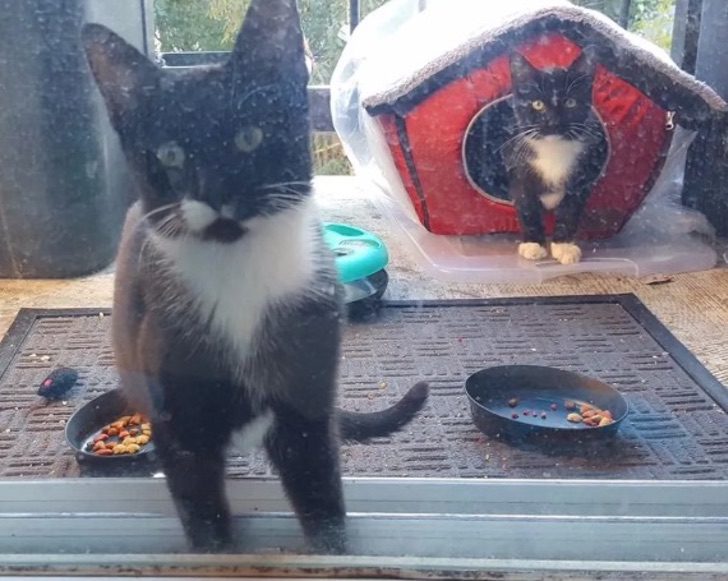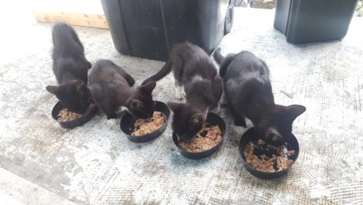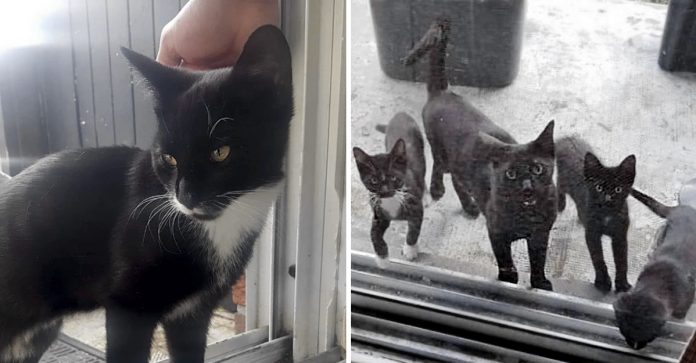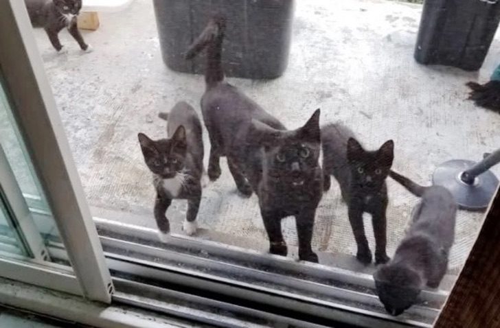 Acontece que a gatinha que eles alimentaram não estava sozinha, pois ela era mãe de quatro outros peludinhos famintos e afetuosos que chegaram à porta de sua casa.