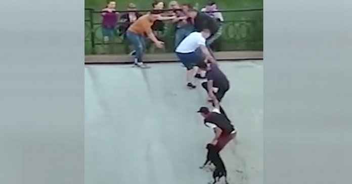 O caso aconteceu em na cidade de Almaty. O cão foi puxado pela corrente e ficou pendurado perigosamente perto de uma borda. Felizmente, um grupo de pessoas que ali estavam, presenciaram a cena e resolveram fazer alguma coisa para ajudar.