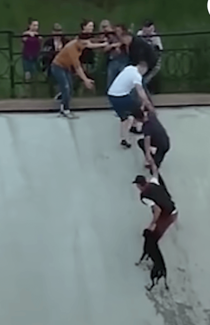 Mas, quando tentou por os pés em terra firme, ele descobriu que o concreto era muito íngreme para subir enquanto segurava o cachorro. E foi aí que a união coletiva fez a força e foi responsável por salvar o dia. Em uma atitude comovente, uma por uma das pessoas que acompanhavam o resgate se deram as mãos e criaram uma corrente humana que se estendeu por todo o aterro, até que eles pudessem enfim alcançar o resgatador e puxá-lo para cima.