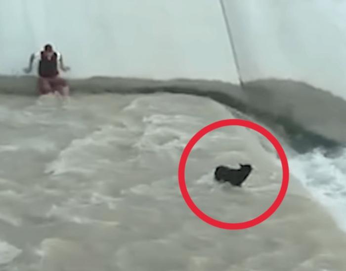 Um dos homens que presenciaram a cena, desceu imediatamente por um aterro de concreto para resgatá-lo. Ele então deu passos cuidadosos através da água correndo em direção ao cachorro, até que ele pudesse gentilmente pegar a criatura assustada e carregá-la para longe da borda.