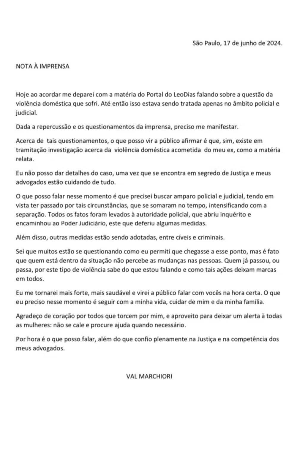 “Hoje ao acordar me deparei com a matéria do Portal do LeoDias falando sobre a questão da violência doméstica que sofri. Até então isso estava sendo tratada apenas no âmbito policial e judicial.