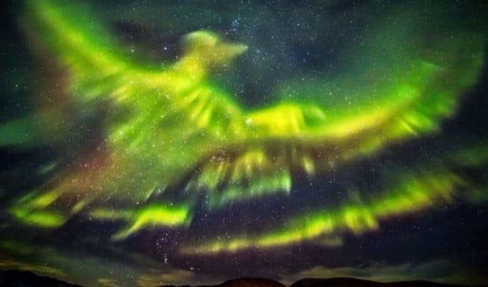 As fotografias apresentadas nesse texto foram feitas pelo fotógrafo Hallgrimur P. Helgason, em Kaldársel, que encontrou uma aurora boreal que realmente parecia uma fênix gigante voando, com suas asas enormes e majestosas estendidas para subir no céu noturno.
