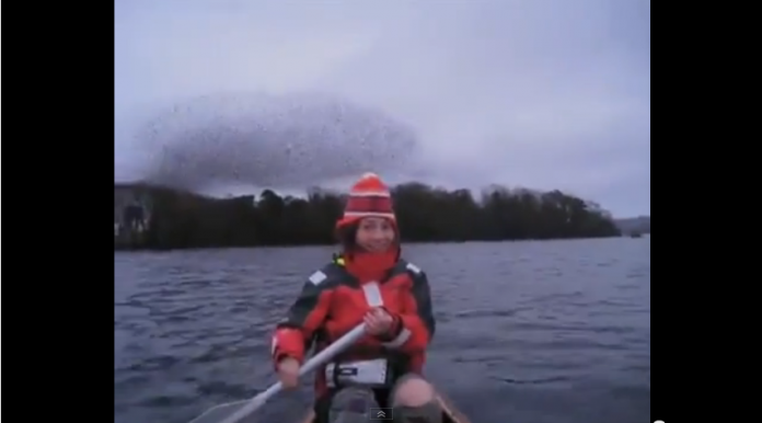 Duas garotas estavam passeando de canoa e foram surpreendidas por um dos grandes fenômenos da natureza, uma formação de esturnídeos (pássaros) voando em nuvens gigantescas.