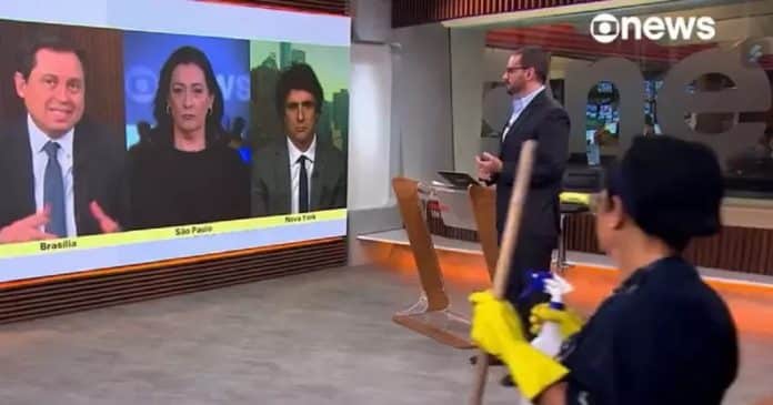 Uma funcionária da limpeza adentrou o estúdio do programa ‘GloboNews Em Pauta’, no Rio, pronta para realizar seu trabalho: com luvas nas mãos, segurava uma vassoura e um frasco de desinfetante. Só havia um detalhe: o telejornal estava ao vivo.