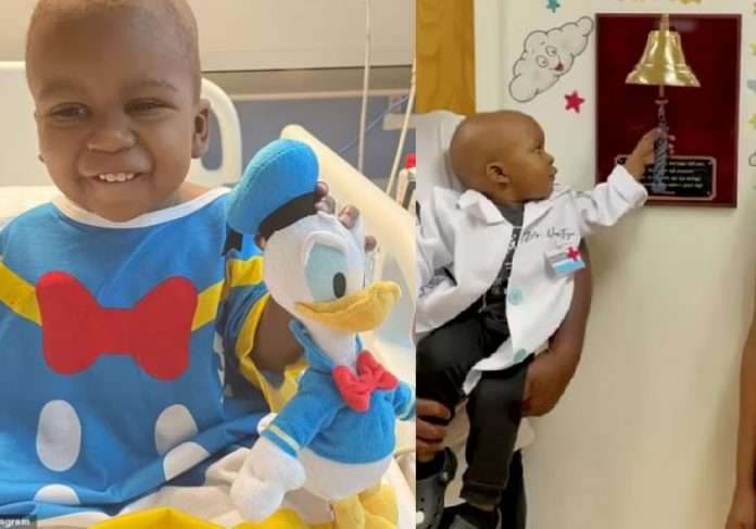 Um menino de dois anos com câncer foi aclamado como um “super-herói” após cair na rede um vídeo em que ele é visto celebrando sua última sessão de quimioterapia usando uma capa dourada. O ápice do vídeo é quando ele toca o sino para indicar que está finalmente livre da doença .