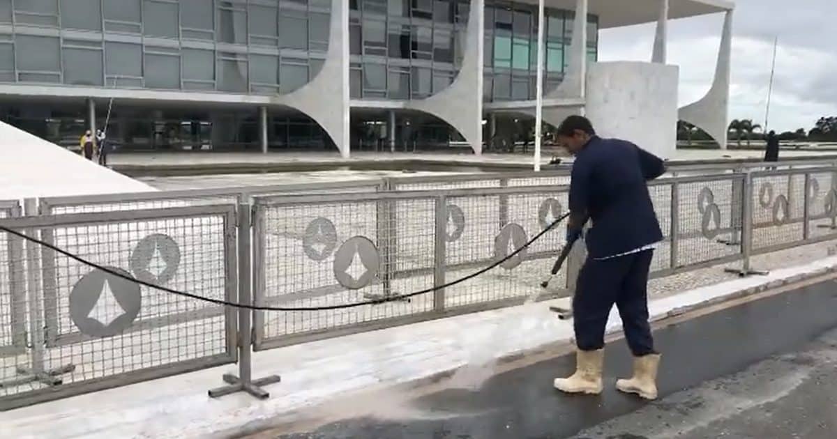 O momento da lavagem foi filmado e teve repercussão nas redes sociais, nesta terça-feira (27). “Já foi jogado sal grosso aqui… (…) Lulinha, a rampa é toda sua”, diz o homem que fez a gravação.