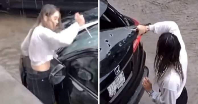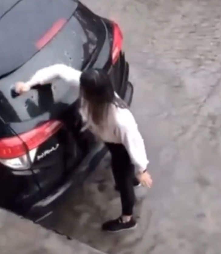 O ataque de fúria da jovem causou danos nos faróis, no capô, nas portas e até nas janelas do carro. O para-brisa traseiro sofreu tantos golpes que acabou se desprendendo do veículo.
