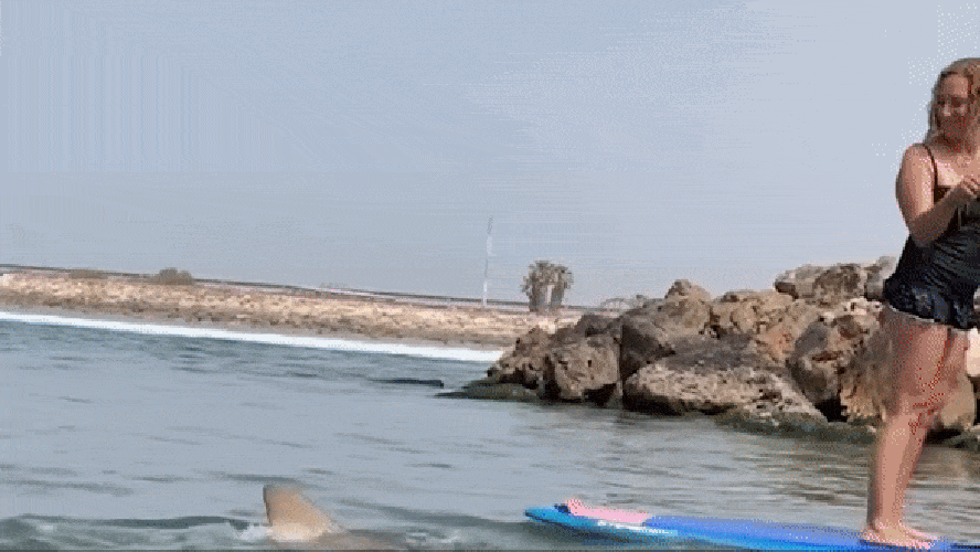 À medida que o tubarão se aproxima, a mulher perde o equilíbrio e cai, aterrissando justo sobre o tubarão, que, surpreendentemente, não demonstra nenhuma reação agressiva. A filmagem, então, revela um cenário mais amplo, mostrando várias pessoas presentes no local testemunhando o momento tenso, porém sem demonstrar sinais de temor quanto a um possível ataque do animal.