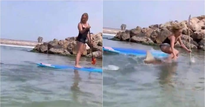 Vídeo: Tubarão derruba mulher que praticava stand-up paddle e ela cai em cima do animal