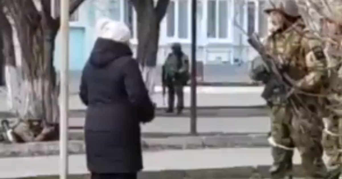 A mulher, que vem sendo chamada de heroína, não teve uma resposta mas continuou a falar com o soldado. Ela pergunta: “Quem é você? Você é russo?”. Com a afirmativa do militar, a mulher dispara, irritada: “Então o que você está fazendo aqui?”.