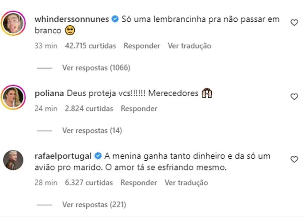 Poliana Rocha, mãe do cantor, que completa 25 anos nesta sexta-feira, também reagiu à publicação: “Deus proteja vocês!!!!! Merecedores.”, disse a esposa de Leonardo.