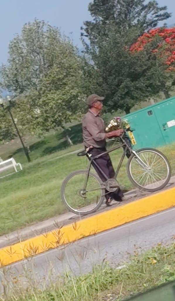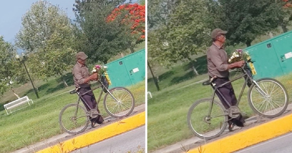“Dava para perceber a quilômetros de distância que ele estava cansado de andar de bicicleta porque descia, andava e voltava, mas isso não o impediu de seguir em frente. Ele olhou com muito amor e sentimento para aquele buquê de flores que carregava nas mãos para que não fossem maltratadas”, escreveu o inetrnauta na legenda de seu post no Facebook.