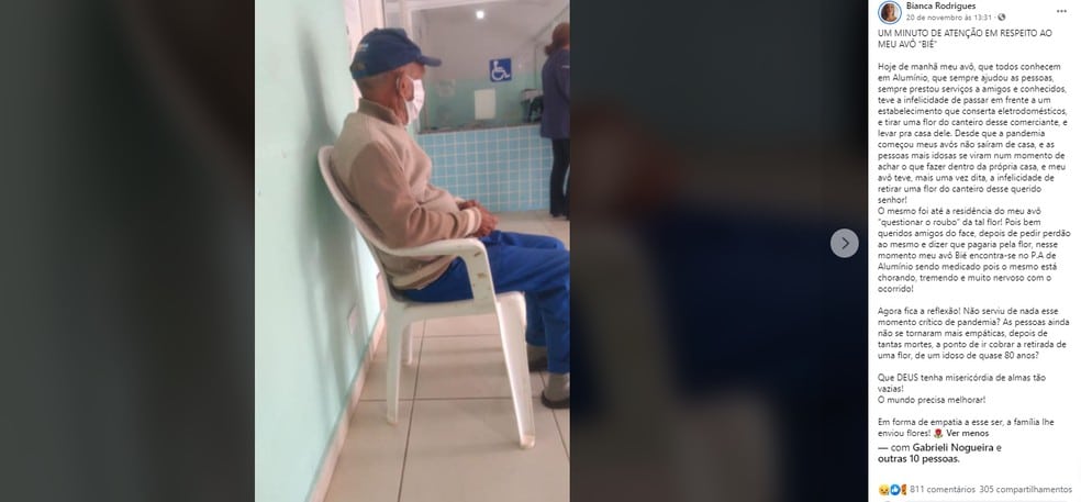 Gabriel Vieira da Cruz, mais conhecido como Bié, é um vovô de 79 anos que adora jardinagem. Na última sexta-feira (20), ele saiu de manhã para caminhar, como faz todos os dias, e passou em frente a um comércio que fica na sua vizinhança. O local tem uma garagem aberta e um canteirinho de flores na frente. Bié, que como já dissemos, ama jardinagem, resolveu pegar uma mudinha do canteiro para plantar em sua casa.